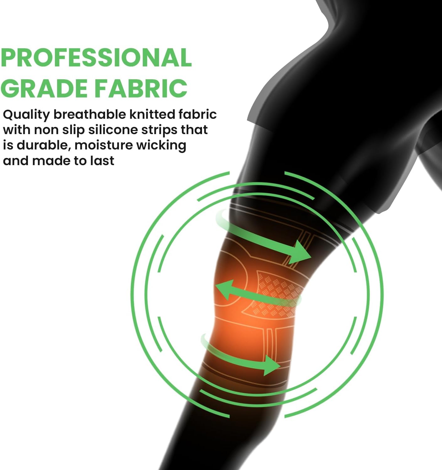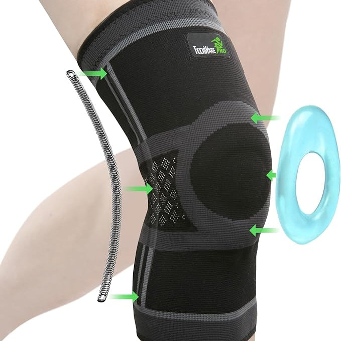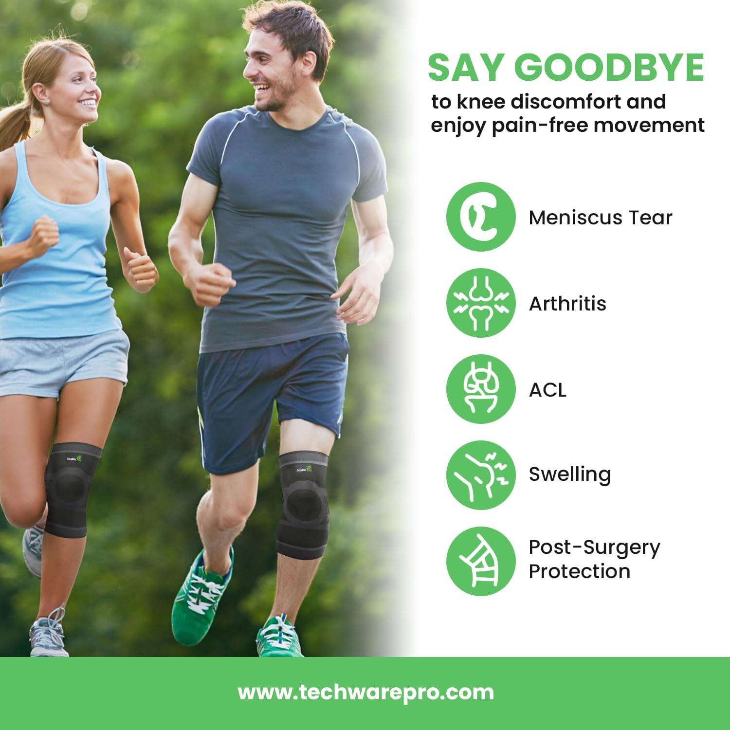 The TechWare Pro Knee Sleeve, designed in the USA, is crafted from breathable, knitted soft fabric with non-slip silicone strips, ensuring it stays in place during activities such as cycling, tennis, CrossFit, and more.