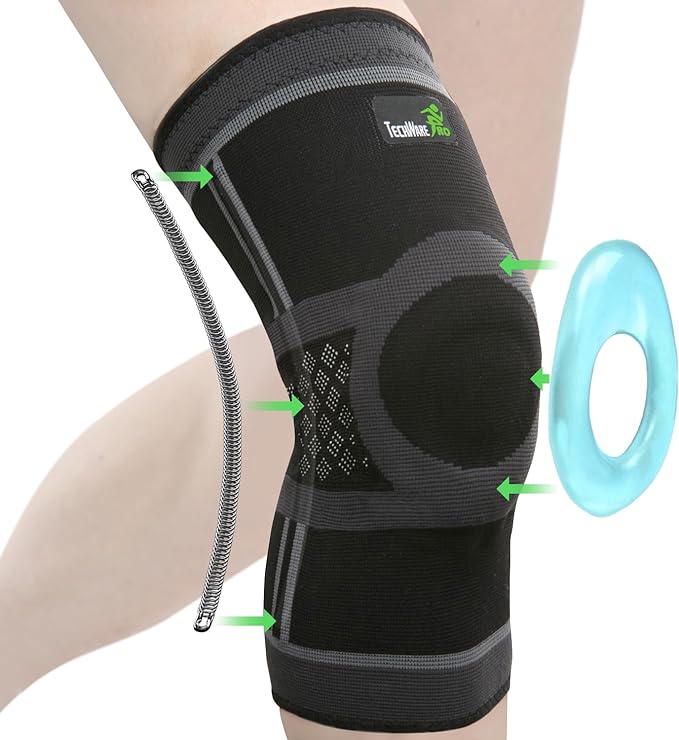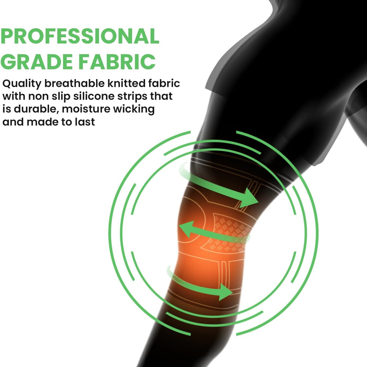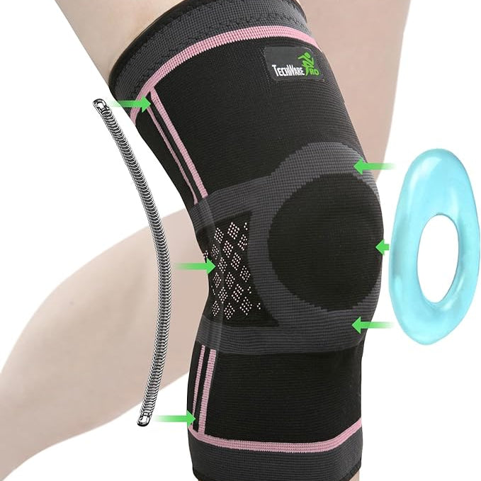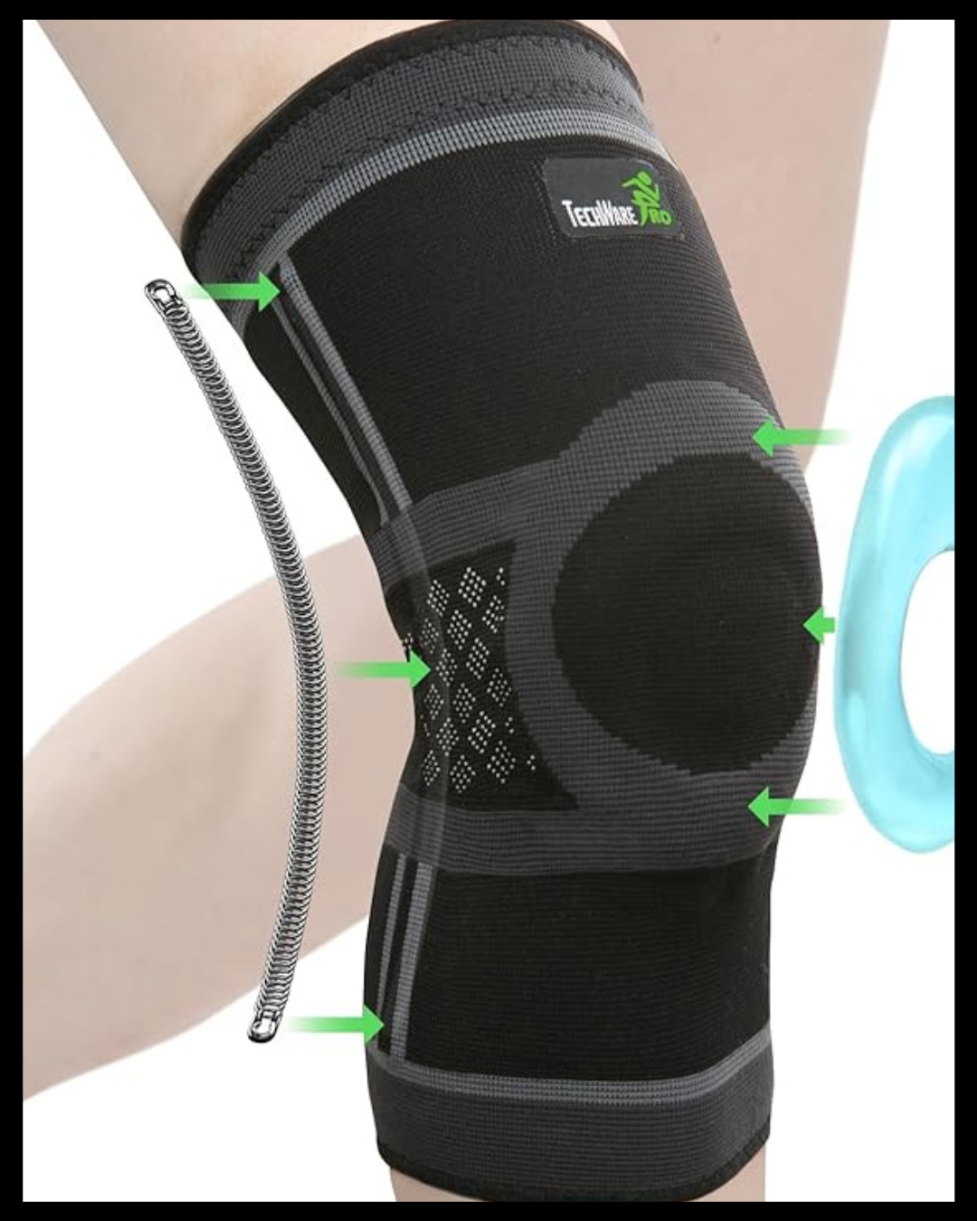 The TechWare Pro Knee Sleeve, designed in the USA, is crafted from breathable, knitted soft fabric with non-slip silicone strips, ensuring it stays in place during activities such as cycling, tennis, CrossFit, and more.